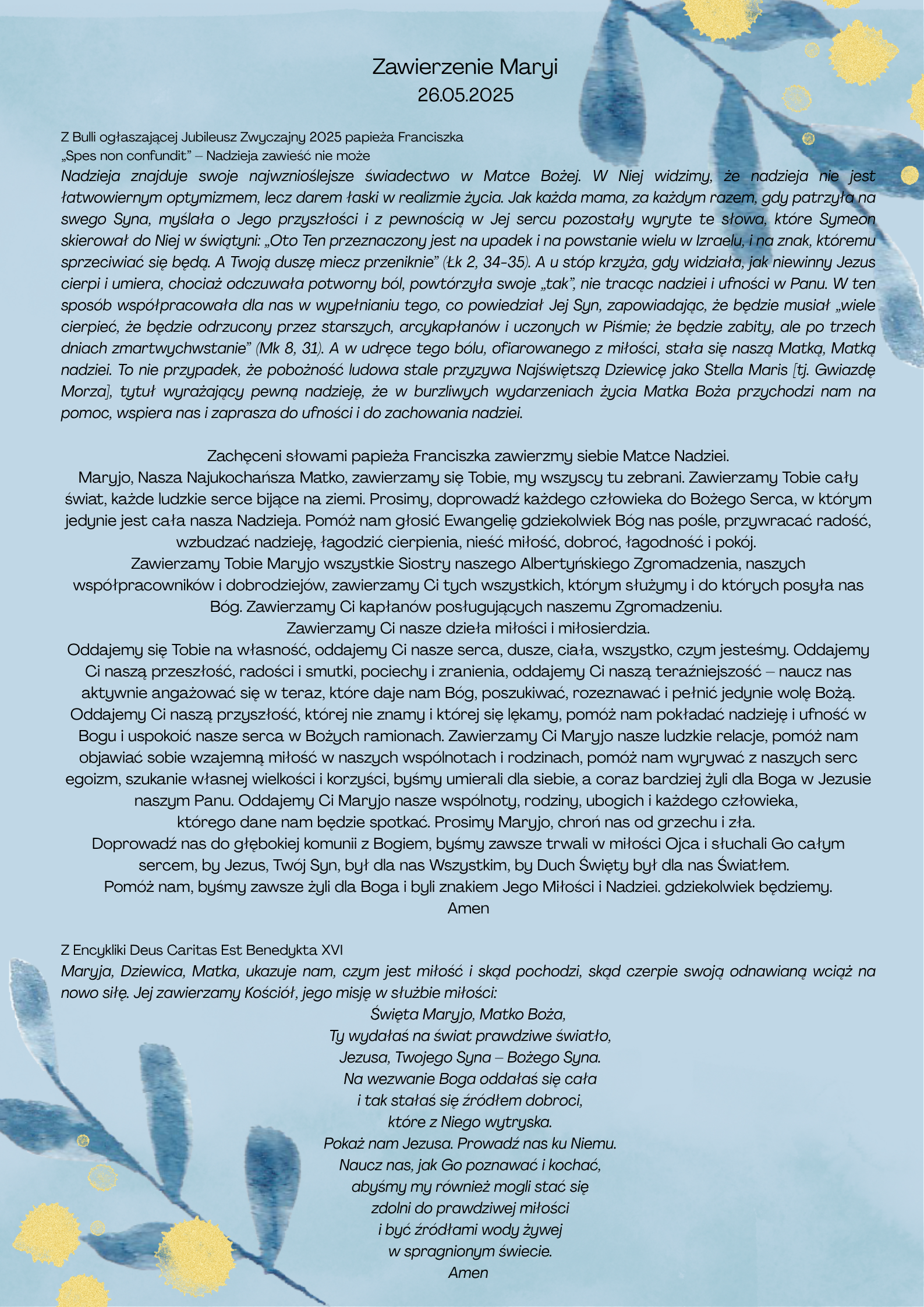 Jak każdego roku w maju nasze Zgromadzenie pielgrzymuje do Matki Bożej Jasnogórskiej, by zawierzyć Jej całą wspólnotę, wszystkie siostry, osoby, którym posługujemy, prowadzone dzieła miłosierdzia i wypraszać potrzebne łaski, dar pokoju dla świata, opiekę nad nami, a w tym roku w sposób szczególny prosić o pogłębienie nadziei w naszym życiu.
